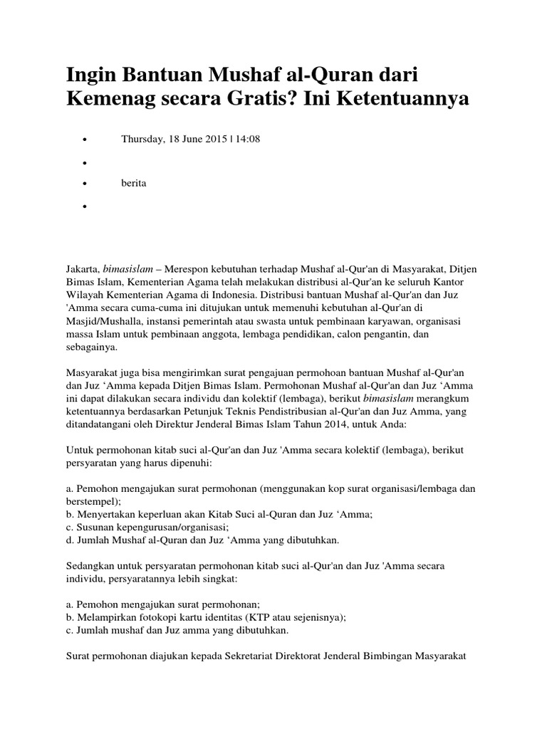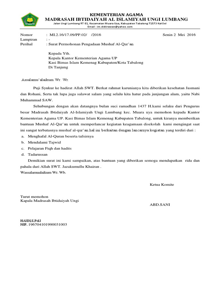 Surat Permohonan Bantuan Al-Qur\'An : Skim Zakat Bantuan Galakan Hafazan Al Quran. Proposal usulan permohonan pengajuan bantuan.proposal terlampir. Atas perhatian dan bantuannya kami ucapkan jazzakumullohu khoiron katsiro. إِنَّ فِي خَلْقِ السَّمَاوَاتِ وَالْأَرْضِ وَاخْتِلَافِ اللَّيْلِ وَالنَّهَارِ لَآيَاتٍ لِأُولِي الْأَلْبَابِ. Permohonan bantuan rehabilitasi asrama pondok pesantren dar al qur'an. Sebuah kegiatan tak selalu didanai secara swadaya oleh pelaksananya.